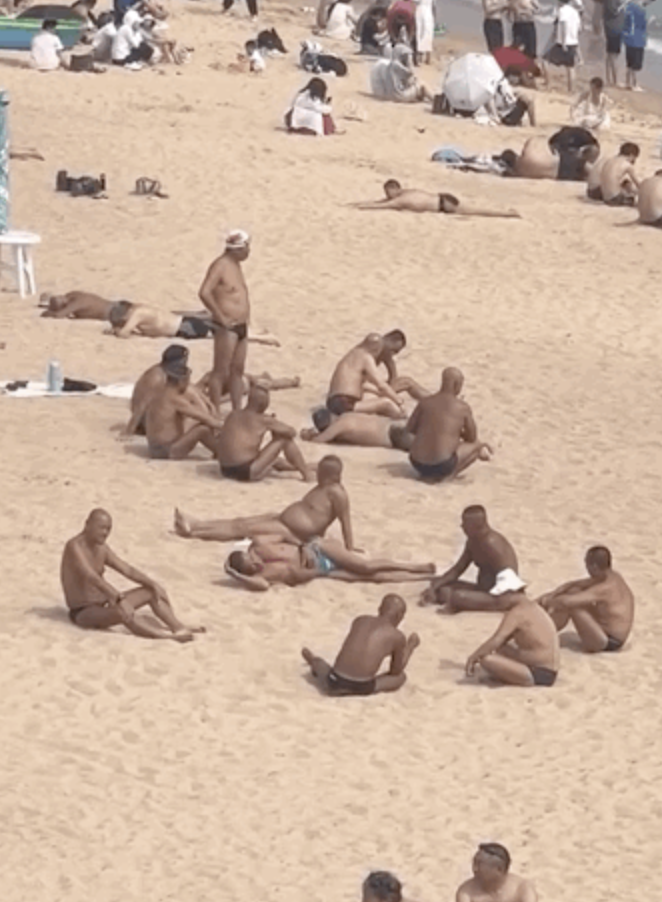 在这个夏天爆火的还有青岛新晋“特产”——“巧克力大爷”,古铜色肌肤、一身肌肉,七仰八叉躺在沙滩上。