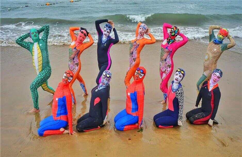 2004年,一种被称作“脸基尼”的尼龙防晒头套横空出世。因其不仅能阻挡紫外线照射,还能防海蜇的蜇伤,迅速获得青岛大妈的厚爱。而身着泳衣,头戴脸基尼,也成了青岛海边固定的海滩秀。