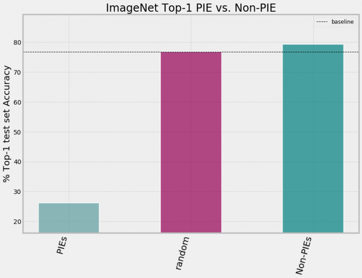 图8:相对于来自 ImageNet 测试集的图像随机样本(粉红色条),PIE ImageNet 图像的随机样本(绿色条)的 ResNet-50 深神经网络的平均 top-1 准确性要低得多。