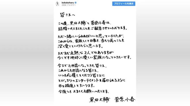33岁的舞蹈与47岁的资深演员黑田大辅,在社交媒体上晒出手写信官宣了结婚的喜讯
