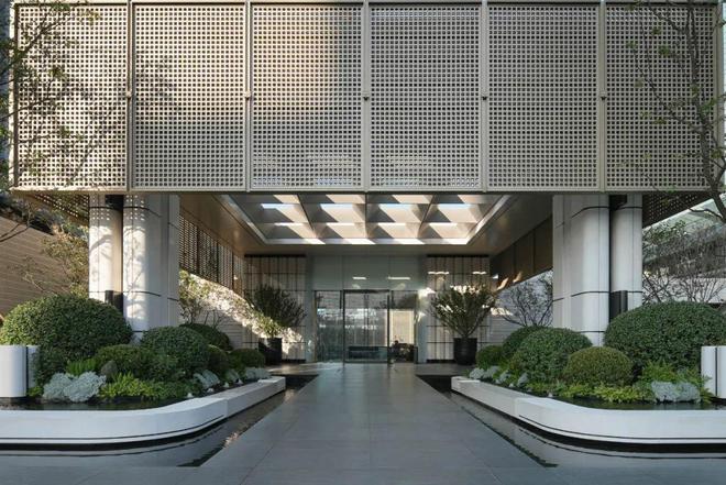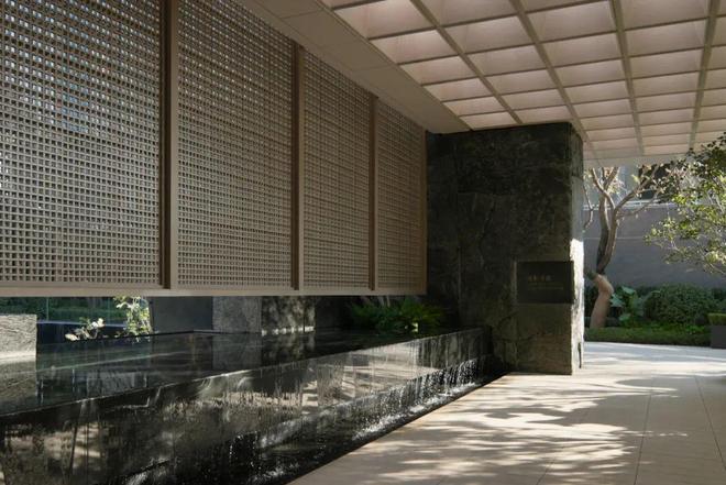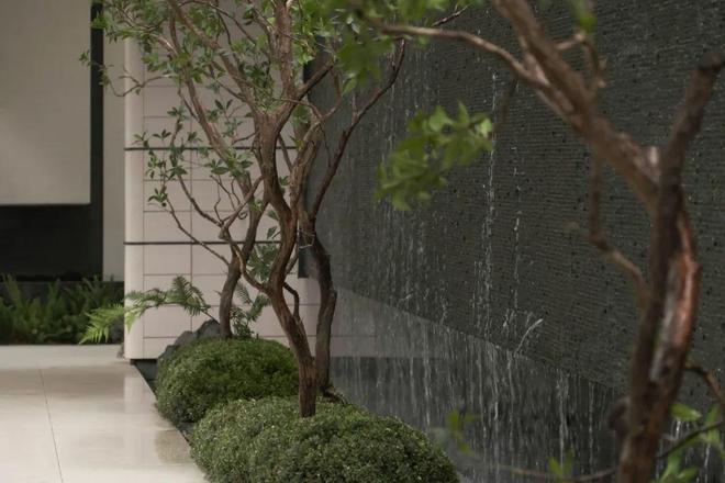 中庭立体园林取留园咫尺山林、小中见大的造园手法,为保视听感官的连续性,社区大堂采用高透宽玻,业主入园便可沉浸观赏飞瀑。