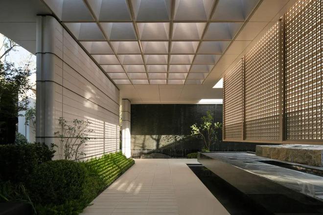 景观无阻地映入眼帘,何尝不是生活的奢侈享受。约50米长屏蔽风雨的通廊衔接社区大堂与归家园径,开放展示流瀑、溪水与疏林的观景宽幅。